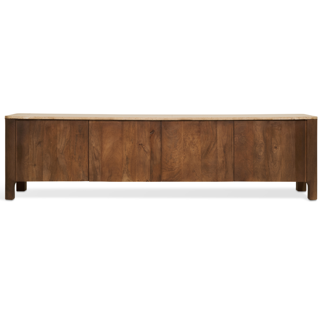 Gemaakt van mangohout en afgewerkt in een warme kastanjebruine tint (‘Chestnut’), straalt het meubel natuurlijke rust uit. De houtstructuur blijft zichtbaar, wat zorgt voor een levendige maar ingetogen uitstraling. Om het meubel perfect in jouw woonkamer te laten passen, heb je de keuze uit twee bovenbladen: ga je voor mangohout voor een mooi geheel, of juist voor het beige marmeren blad als subtiele blikvanger?